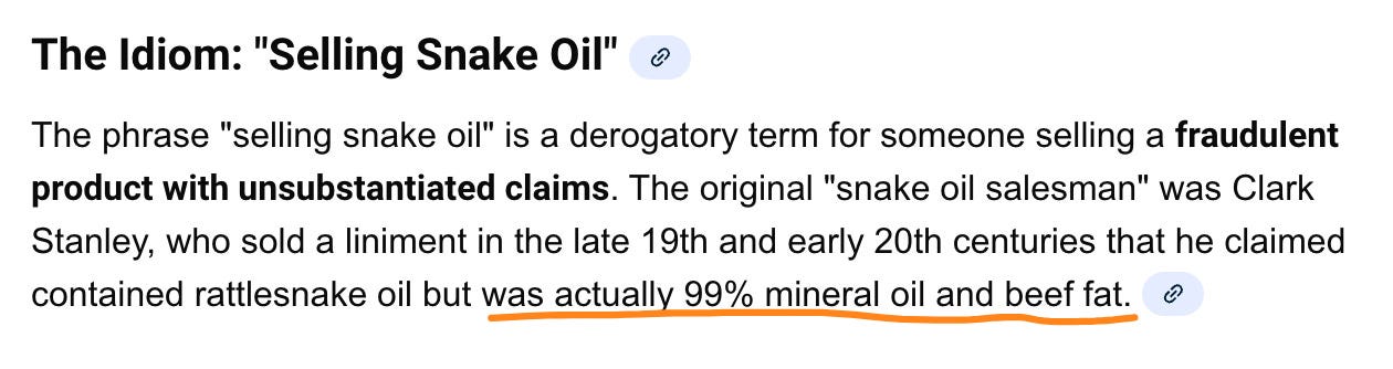 Without a translator standing over you, the truth is obvious. If you ate something that made you nauseous and gave you diarrhea, you’d call it food poisoning. But the interpreter shows up, waves a credential, and insists it’s a “positive response” that proves the chemical is working. This is the oldest con in the book: sell the snake oil, redefine the reaction, then blame the customer for noticing. Just like DDT instead of Polio, just like raw sewage and the black plague, just like pesticides and small pox…And speaking of snake oil, a reader just pointed out that one popular, known influencer is literally selling it. Will we ever learn?